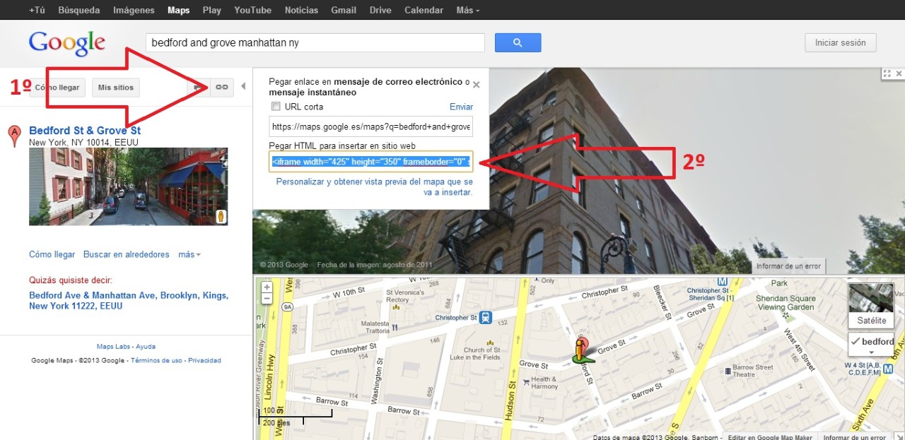 4. Ahora vamos a hacer dos acciones para obtener el código embebido que insertaremos como Widget en nuetra página de Webnode. Primero hacemos clic sobre el icono de la cadena y después, se desplegará una pequeña ventana con dos códigos. Copiamos entonces el que indica la segunda flecha.